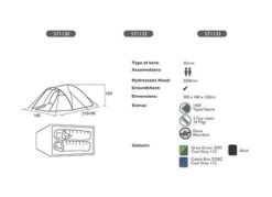 The front door with a full mesh screen, multiple guylines for stability, taped seams, sewn-in groundsheet and hood over the apex ventilation ensure practical shelter and comfort that will cope with hard holiday use.