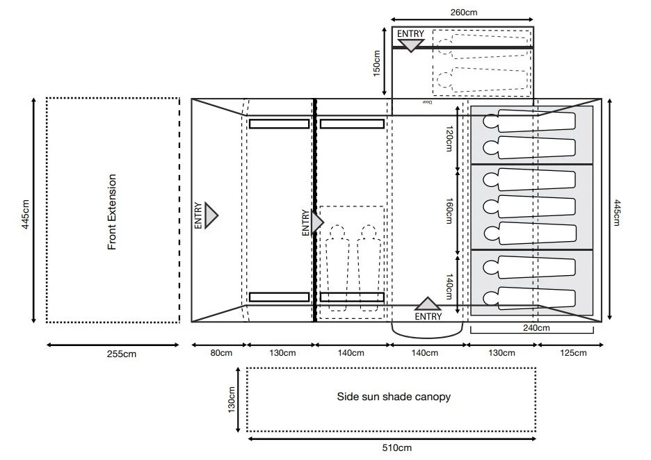 A maximum sleeping capacity of eleven can be reached should you choose to purchase a secondary optional two-berth inner tent. The parallel design of this porch area means that only a fraction of extra space is utilized at the side of the family tent.
